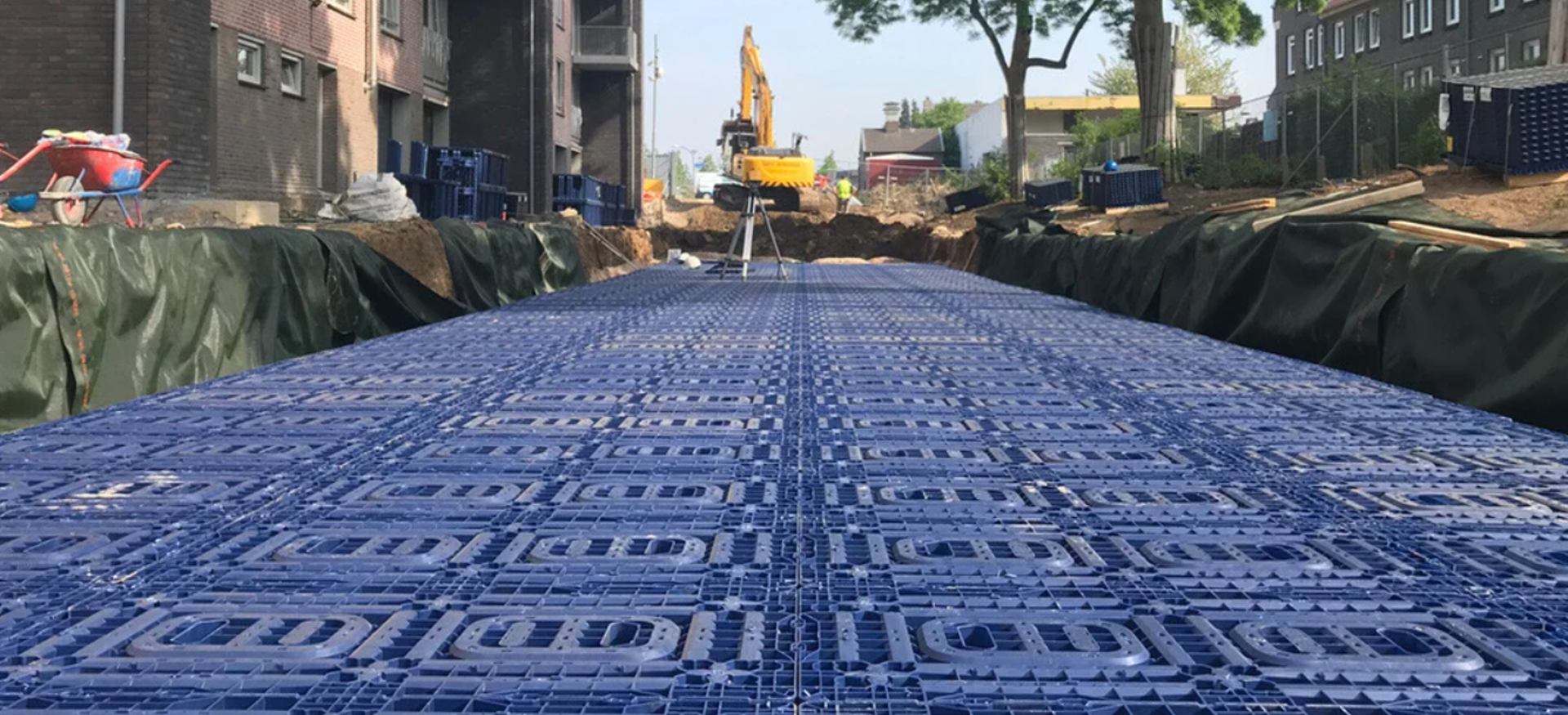 Wat het Q-Bic Plus systeem zo uniek maakt, is de volledige toegankelijkheid. Het is eenvoudig te inspecteren en te reinigen, in zowel de lengte- als breedterichting. Dit garandeert langdurige optimale prestaties. Q-Bic Plus heeft een open structuur, ‘als een zwembad onder de grond,’ aldus Jeffrey. Ook de korte doorlooptijd van het bouwrijp tot het woonrijp maken van de locatie, speelt een rol bij de keuze. Jeffrey: ‘Bij dit project zit daar per bouwfase steeds maximaal een paar weken tussen. Door gebruik te maken van de Q-Bic Plus infiltratiekratten en Tegra PP-inspectieputten, is dat geen probleem. Dit pakket is snel gebouwd en kan een hoge druk aan. De krattenvelden kunnen daarom al voor de bouwfase worden aangebracht. Kranen en vrachtwagens hebben in de bouwfase zo de beschikking over het gehele perceel.’ , is dat geen probleem.