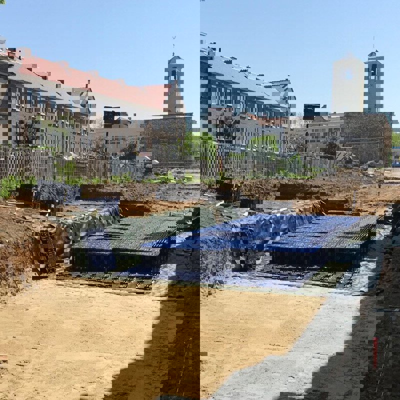 Waterberging brengt overtollig regenwater snel onder de grond. Met infiltratiekratten wordt het water tijdelijk vastgehouden waarna het langzaam infiltreert in de bodem. Jeffrey: ‘Zodra de oppervlaktes van het straatwerk en de daken bekend waren, hebben we contact met Wavin gezocht. De vraag die er lag was: hoe kunnen we zo’n groot volume zo slim en duurzaam mogelijk opvangen en oplossen? De beschikbare ruimte maakte dat we al snel bij de Q-Bic Plus units uitkwamen. Het hoge bergingsvolume in combinatie met de flexibiliteit van het systeem sluit precies aan bij onze behoefte, het geeft ons de ontwerpvrijheid waar deze ondergrond om vraagt.’